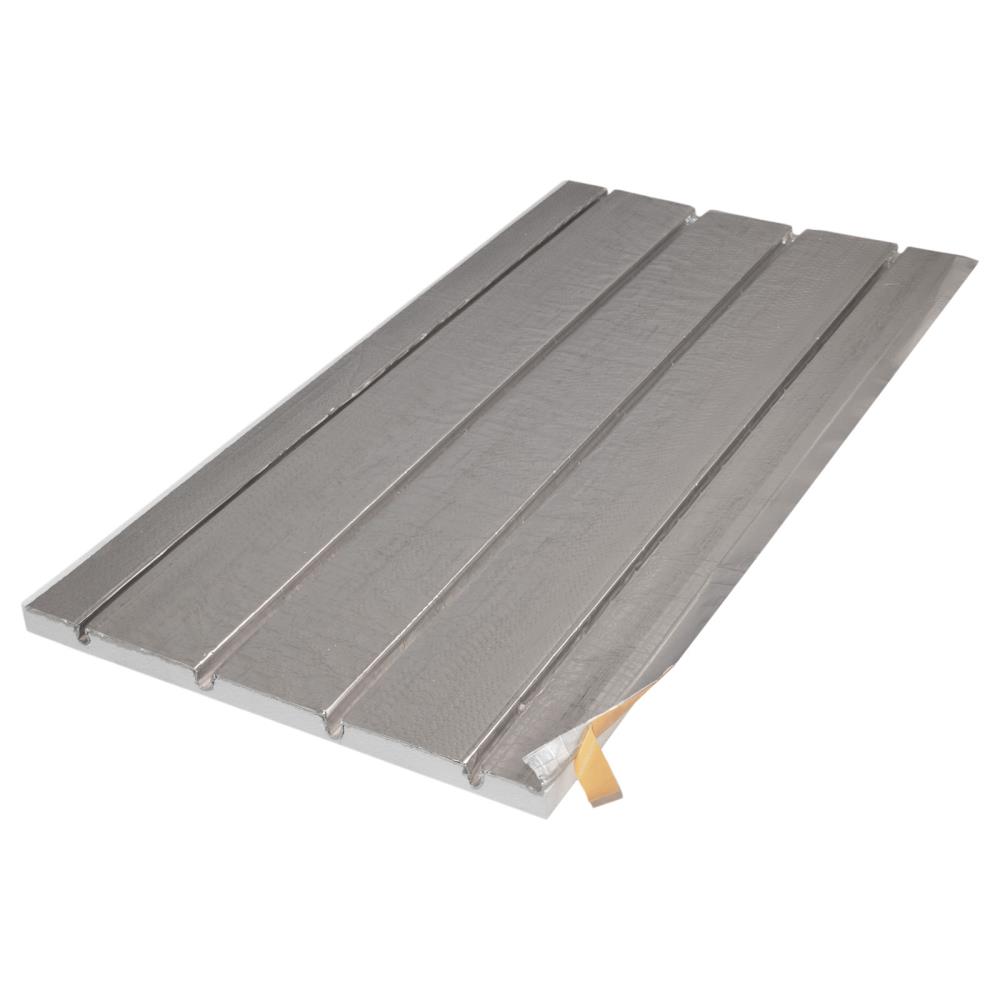 Längsplatte aus EPS-Hartschaum mit gitternetzverstärkter Aludeckschicht. Integrierte Führungskanäle zur Aufnahme von Heizrohren in der Dimension 16 mm. Geeignet für Verlegeabstände von 12,5 und 25,0 cm. Mit einseitigem, selbstklebenden Folienüberstand.