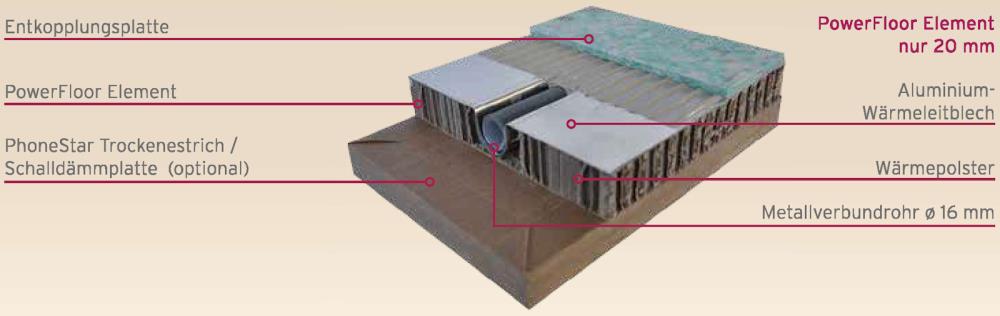 Bei diesem Systemaufbau ist eine Verklebung der Systemkomponenten erforderlich. Die Verklebung der PowerFloor Elemente erfolgt unterschiedlich je nach Untergrundart. Der Untergrund muss für die Verklebung sauber, trocken und frei von Trennschichten aller Art sein.