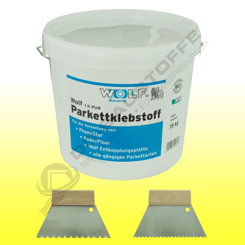 - Wolf 1K Parkettklebstoff + Wolf Zahnspachtel (optional)