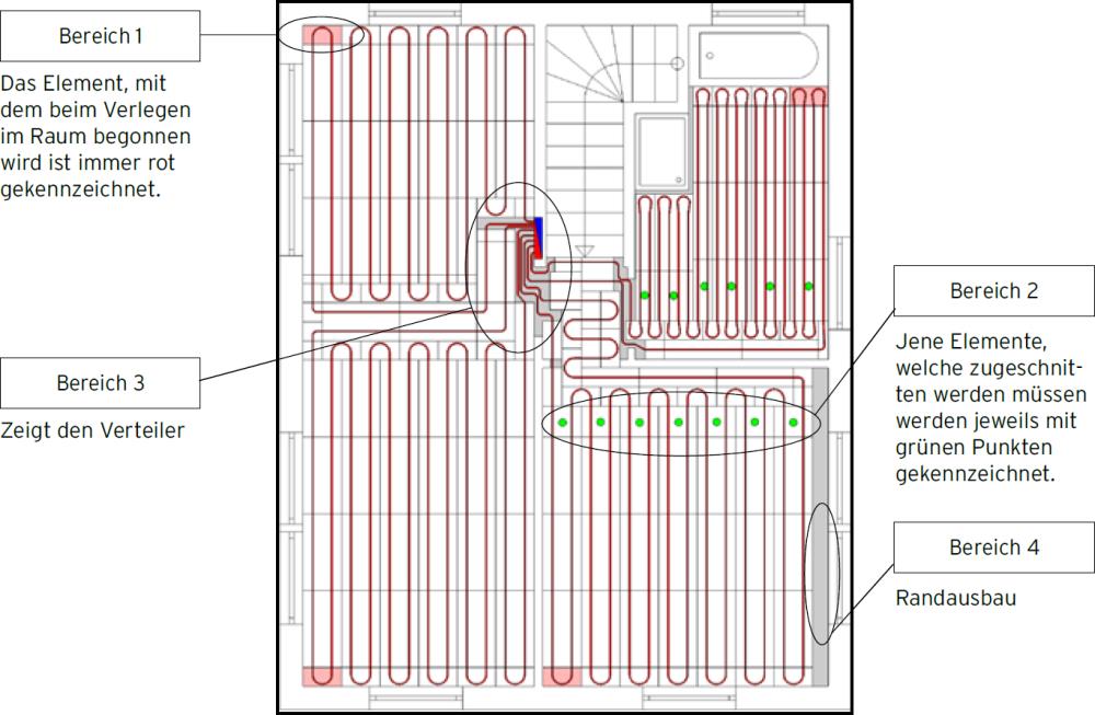 Machen Sie sich vor der Verlegung mit der zum Objekt zugehörigen Verlegeplanung vertraut. Anhand des folgenden Musterplans werden die unterschiedlichen Systembereiche erläutert: