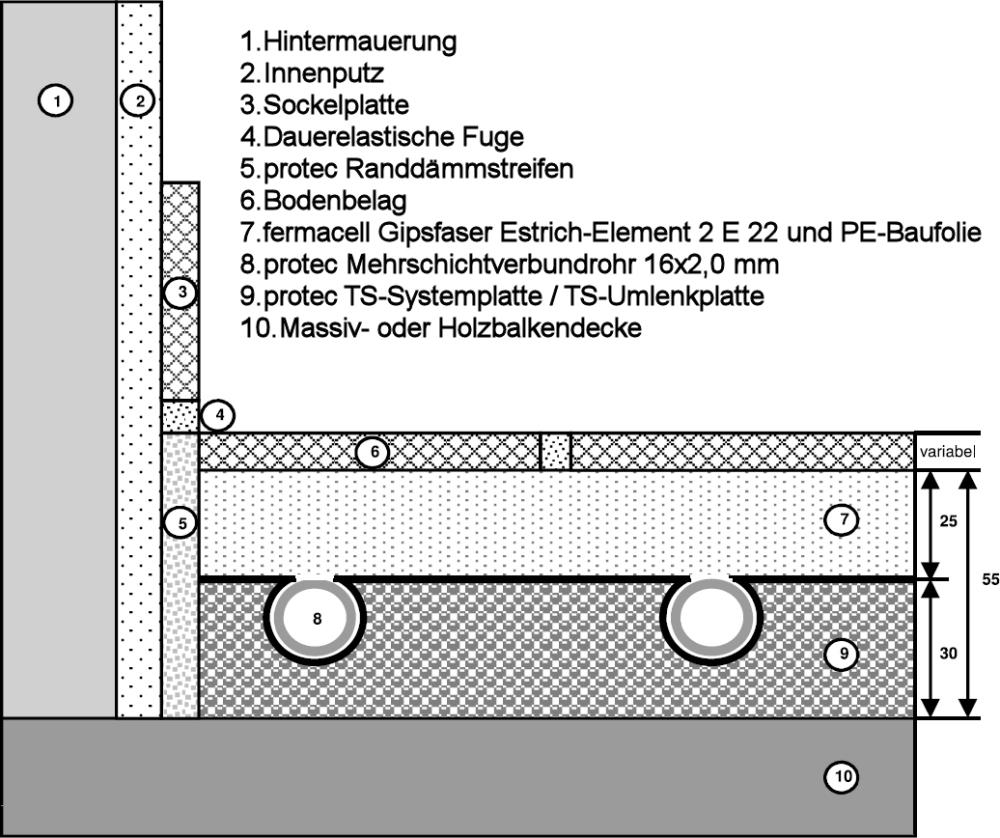 Die Systemplatten (inkl. der eingebrachten Rohre) haben eine Gesamtstärke von 30 mm. Hierzu kommen die Estrich-Elemente mit einer Stärke von 25 mm, so dass eine Gesamtstärke von 55 mm bis zur Oberkante des Trockenestrichs zzgl. Bodenbelag erreicht wird.