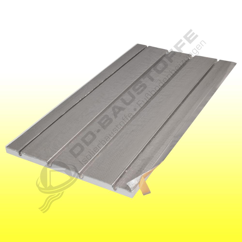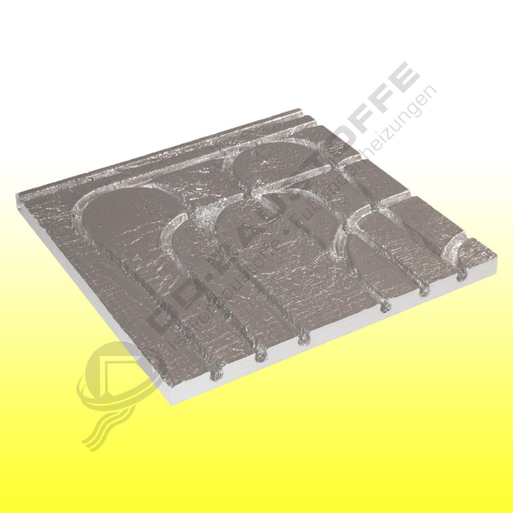 Längsplatte aus EPS-Hartschaum mit gitternetzverstärkter Aludeckschicht. Integrierte Führungskanäle zur Aufnahme von Heizrohren in der Dimension 16 mm. Geeignet für Verlegeabstände von 12,5 und 25,0 cm. Mit einseitigem, selbstklebenden Folienüberstand. Technische Daten: