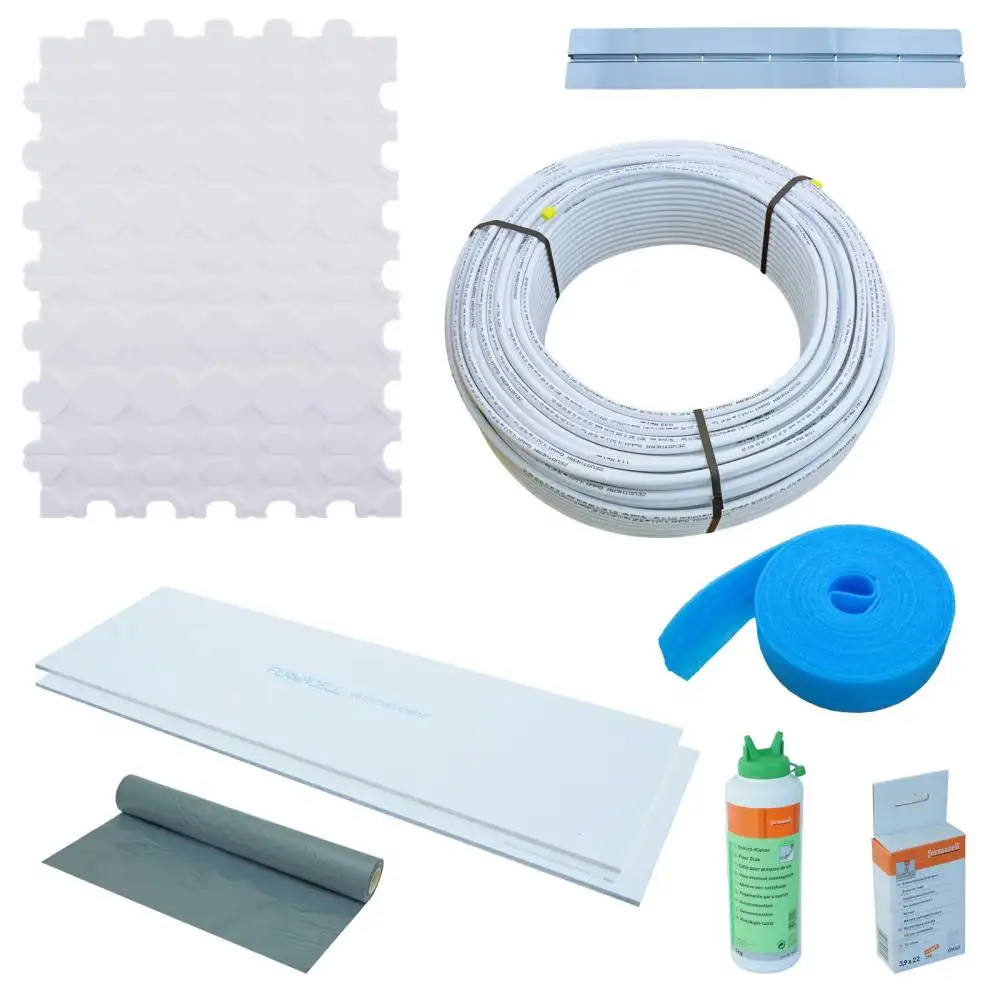 Verschiedene Paketgrößen und Verlegaeabstände lieferbar. Die genauen Paketinhalte sowie den rechnerischen Materialbedarf können Sie den unten stehenden Tabellen entnehmen. Außerdem können Sie auswählen, ob die Trockenbaukomonenten im Paket enthalten sind. Im Wohnbereich empfehlen wir die Verwendung eines Verlegeabstandes von 12,5 cm. Bitte beachten Sie jedoch, dass die erforderlichen Verlegeabstände immer bauseits zu überprüfen sind! Die Leistungstabellen des Systems finden Sie weiter unten in der Artikelbeschreibung.