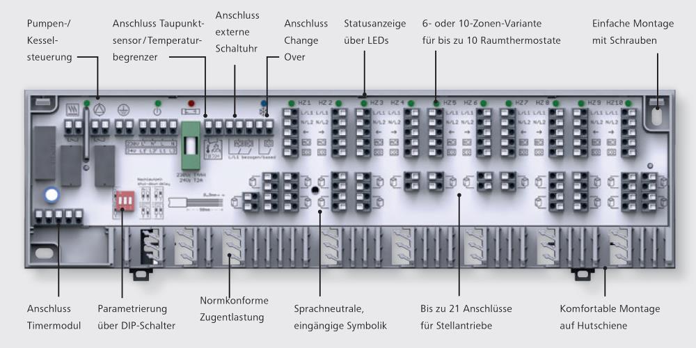 Die Variante 6-Kanal ist für bis zu 6 Raumregler und 15 Stellantriebe geeignet, die Variante 8-Kanal für bis zu 8 Raumregler und 17 Stellantriebe und die Variante 10-Kanal für bis zu 10 Raumregler und 18 Stellantriebe. Pro Verteiler wird eine Regelklemmleiste benötigt. Die Montage erfolgt normalerweise direkt im Verteilerschrank.