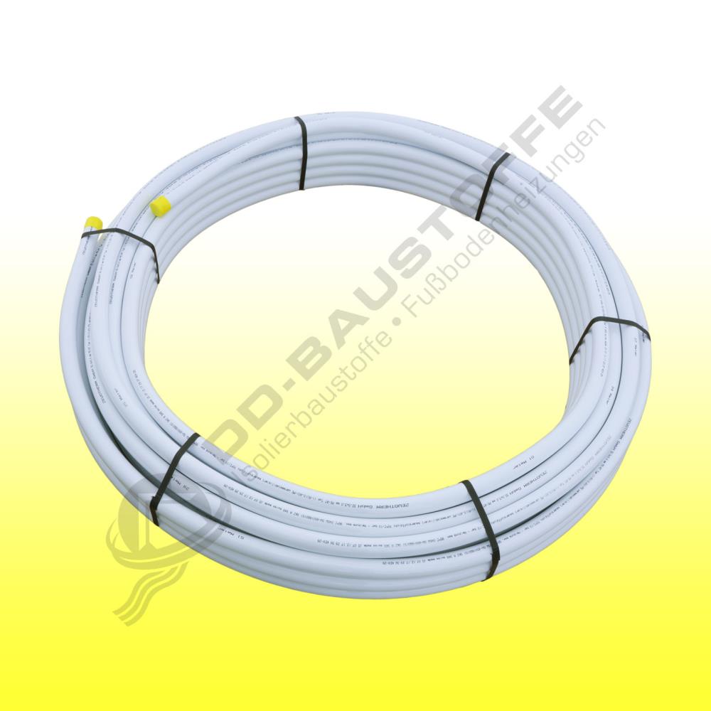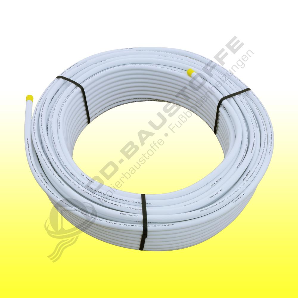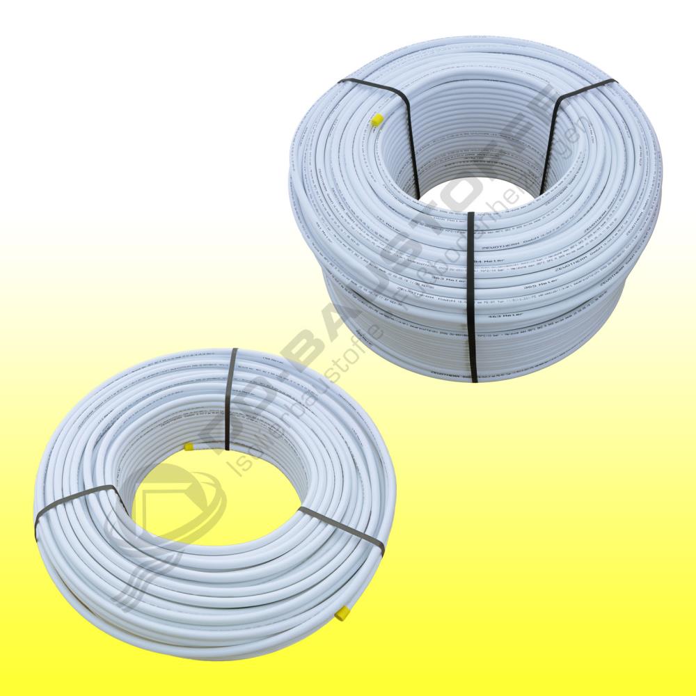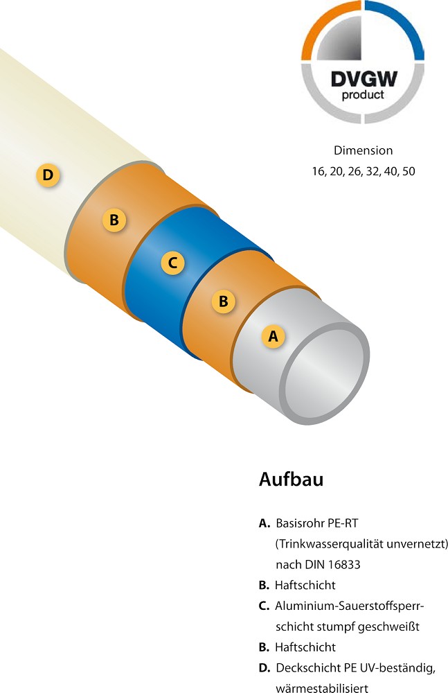 Das 5-schichtige Metallverbundrohr wird insbesondere bei Installationen eingesetzt, die in Verbindung mit Trinkwasser stehen und DVGW-Anforderungen entsprechen müssen. Das PE-RT/AL/PE-RT Metallverbundrohr ist Systembestandteil des ratiodämm Press-System «Premium». Durch das Metallverbundrohr werden die Vorzüge eines Kunststoffrohres mit denen eines Metallrohres vereint, es ist gleichermaßen flexibel und robust, äußerst druck- und hitzebeständig, hygienisch und einfach zur verarbeiten. Das Rohr besteht aus einem Basisrohr, das aus temperaturbeständigem Polyethylen extrudiert wird. Im Co-Extrusionsverfahren wird außen eine dünne Haftschicht (Primer) aufgetragen und mit einer 0,2 mm dicken Aluminiumschicht versehen, stumpf längs verschweißt und auf das Innenrohr kalibriert. Im Überzugsverfahren wird dann eine weitere Haftschicht und äußere Deckschicht aus Polyethylen aufgetragen. Dieser gleichmäßige Rohraufbau mit minimierter thermischer Ausdehnung sorgt durch die zwei Haftschichten für eine dauerhafte Verbindung. Die Kombination von Kunststoff und Aluminium macht dieses Rohr dauerhaft haltbar und sicher. Der biegeformstabile Aluminiummantel garantiert eine 100%-ige Sauerstoff- und Wasserdampfdiffusionsdichte. Diese Sperrschicht schützt vor evtl. Übertragungen von Geruch und Korrosion, die im Laufe der Zeit zu Schäden an der Anlage führen könnten. Auch ist durch die glatte Oberfläche die Rohrinnenseite für normale, im Wasser präsente Elemente unangreifbar, Reibungspunkte werden ausgeschlossen und Ablagerungen vermieden, die eine spätere Korrosion zur Folge haben könnten.
